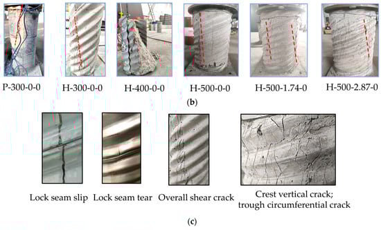 It can be seen from Figure 8a that the axial compression response and failure mode of the specimens with different diameters are quite different. The ductility of specimen H-300-0-0 is the worst, and as its bearing capacity continues to rise, the lock seam of the HCST opens, and the core concrete loses the constraint of the HCST, leading to shear failure. The diameter-to-thickness ratio of specimen H-500-0-0 is greater than that of specimen H-400-0-0. However, because the helix angle of specimen H-500-0-0 is relatively small, its ductility is greatly improved compared to specimen H-400-0-0. Based on the above analysis, it can be inferred that due to the smaller helix angle, the HCST bears less of an axial load and can provide more hoop restraint.