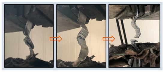 - Damage Mode: After peeling off the specimen, it was observed that the HCST and core concrete were tightly interlocked, with no significant slipping in the concrete. The core concrete underwent shear failure almost perpendicular to the helix angle (Figure 6b). The tensile failure test of the lock seam is shown in Figure 7. The lock seam opened by unfolding, indicating that the dents or bites in the crests and troughs observed during the test were not the strength limit of the plate, but rather a local stress release process. The lock seam strength of the HCST was identified as a key factor affecting the axial compression performance of the CFHCST.