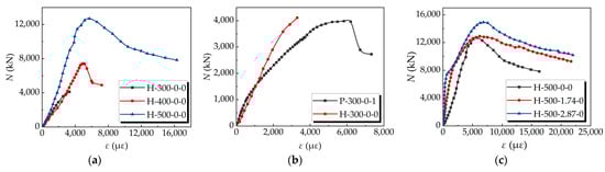 It can be seen from Figure 8b that the peak strain of specimen H-300-0-0 is 3927 με, while that of specimen P300-0-1 is 5826 με. When the HCST adopts a larger helix angle and the other specimen parameters (diameter–thickness ratio, steel strength, concrete strength, etc.) are the same, its restraining effect on the core concrete is not as good as that of the plain straight steel tube.