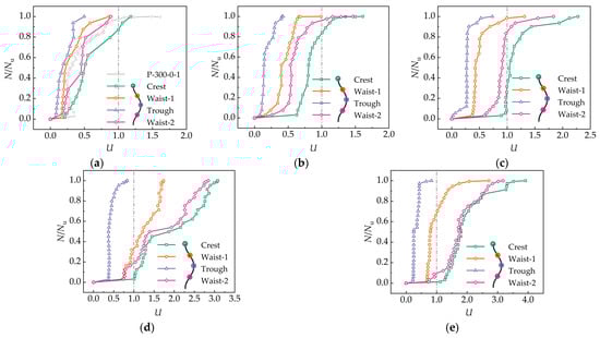 There were notable differences in the transverse expansion at different positions of the HCST. The crest exhibited the most effective hoop confinement, while the trough had the least effect. Comparing specimens H-300-0-0, H-400-0-0, and H-500-0-0 (Figure 10a–c), reducing the helix angle increased the transverse deformation coefficient at each position of the HCST. This indicates that decreasing the helix angle enhances the HCST’s ability to provide circumferential constraint to the core concrete. For example, at peak loads, the transverse deformation coefficients at the peaks for specimens H-300-0-0, H-400-0-0, and H-500-0-0 were 1.18, 1.61, and 2.27, respectively. Similarly, the transverse deformation coefficients of waist-1 and waist-2 significantly increased as the helix angle decreased. The transverse deformation coefficient at the trough also increased with decreasing helix angle, but it remained less than one, indicating that the force at the trough was primarily vertical compression.
