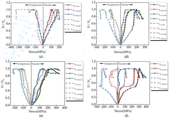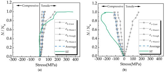 Comparing specimens H-300-0-0, H-400-0-0, and H-500-0-0 (Figure 11a–d), it can be concluded that the CST stress modes are similar, but as the helix angle decreases, the hoop stress provided by each part of the CST increases when the peak load is reached. Comparing specimens H-500-0-0, H-500-1.74-0, and H-500-2.87-0 (Figure 11d–f), it can be concluded that with an increase in the longitudinal reinforcement ratio, the hoop stress of each part of the CST increases when the specimen reaches peak load, and the hoop restraint force at the trough and waist increases more significantly.