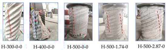The shear angle of the concrete core can be predicted when the concrete core is subjected to shearing and damage under the axial load of both CFST columns and STRC columns [35,36]. However, predicting the shear direction of the CFST core is generally challenging, due to the heterogeneity and nonlinear characteristics of concrete. The concrete core shear for each specimen is summarized in Figure 12. It can be observed that the shear direction of the CFST core deviates from the helical direction of the outer CST.