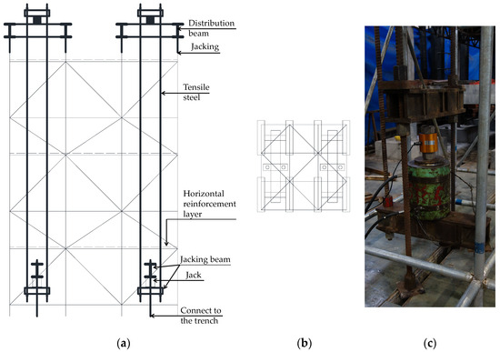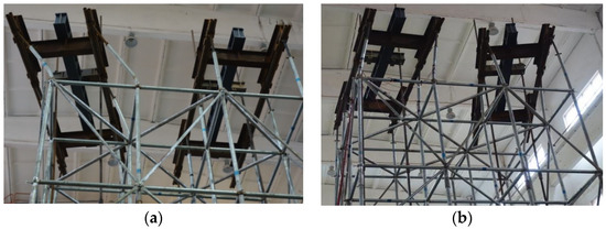 The test was carried out by self-balancing loading. Uniform and symmetrical loading of the whole scaffolding was applied by two 100 t jacks at the bottom, reaction beams, and a double-layer distribution beam at the top. The loading device for the test is shown in Figure 4. The applied load is 10 kN per stage for scheme I and 20 kN for scheme II. Each level of loading lasted for 10 min. Eventually, the entire scaffolding was destroyed.