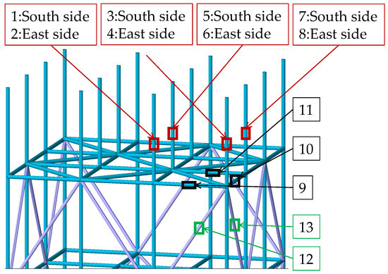 The arrangement of the strain measurement points is shown in Figure 5. Measurement points 1, 3, 5, and 7 are located on the south side of the cantilever end of the upright rod. Measurement points 2, 4, 6, and 8 are located on the east side of the cantilever end of the upright rod. Measurement points 9, 10, and 11 are located in the middle of the uppermost horizontal rod. Measurement points 12 and 13 are located in the middle of the uppermost diagonal rod.