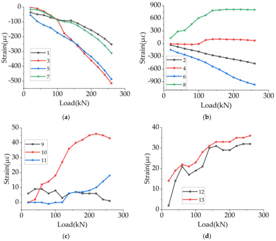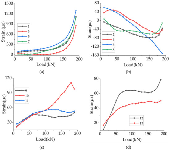 Load—strain curves at the measurement points in scheme II. (a) Upright rod load-strain diagram 1. (b) Upright rod load-strain diagram 2. (c) Horizontal rod load-strain diagram. (d) Diagonal rod load-strain diagram.