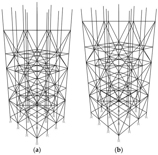 SAP2000 software was used to analyze the modeling formwork for two different erection schemes. The upright rods, horizontal rods, and horizontal diagonal rods of the scaffolding are made of round steel pipes with dimensions of Φ48 × 3.0. The vertical diagonal rods are made of Φ32 × 2.0 round steel pipes. The steels are Q235 carbon structural steel. The modulus of elasticity of the steel is taken as E = 206 MPa, Poisson’s ratio is V = 0.3, and the mass density is 7850 kg/m3. The upright rods are assumed to be rigidly connected. The connection nodes of the upright rods and horizontal rods are considered semirigid nodes. The rotational stiffness of the node is . Both horizontal and vertical inclined rods are defined as rods articulated at both ends and only axial forces are considered. The support constraint is assumed to be an articulated support that constrains displacements in the X, Y, and Z directions.
