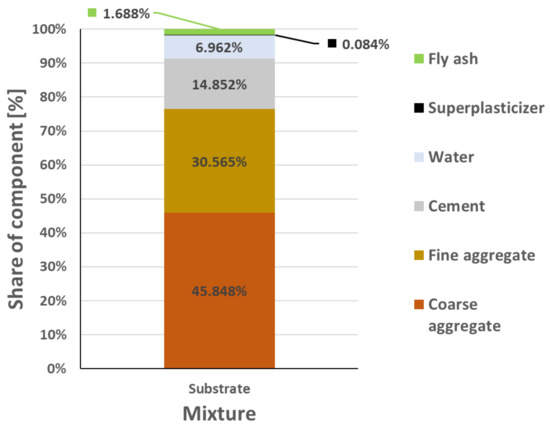 Figure 2 shows the weight composition of the concrete mixture used to make the substrate. To make the substrate, a concrete mixture was used, composed of cement CEM II A-LL 42.5 R, fly ash, fine aggregate (up to 2 mm), and coarse aggregate (up to 8 mm). Moreover, to obtain the appropriate consistency of the concrete mix, 2.0 L of superplasticizer was used.