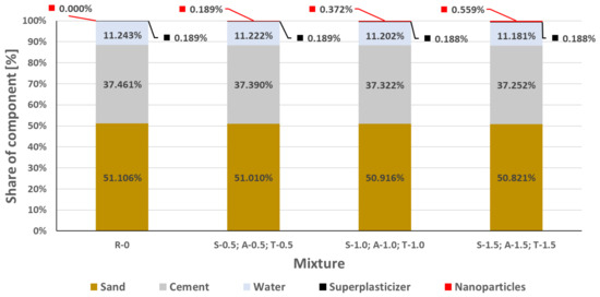 The following ingredients were used to make high-strength nano-modified cement mortars for overlays: Portland cement CEM I 42.5 R, dried quartz sand (up to 2 mm), superplasticizer dosed in an amount of 0.5% of the cement mass, water, and three kinds of nanoparticles. The following designations were assigned to the tested mortars: R—mortar without the addition of nanoparticles, S—mortar with the addition of silicon oxide nanoparticles, A—mortar with the addition of aluminum oxide nanoparticles, and T—mortar with the addition of titanium oxide nanoparticles. The percentage of nanoparticles in relation to the cement mass was 0% for the reference mortar (R-0), 0.5% (series: S-0.5, A-0.5, T-0.5), 1.0% (series S-1.0, A-1.0, T-1.0), and 1.5% (series S-1.5, A-1.5, T-1.5). Figure 3 shows the compositions of all mortar series used to make the high-strength cement overlay.