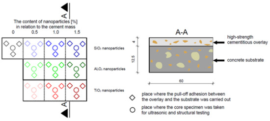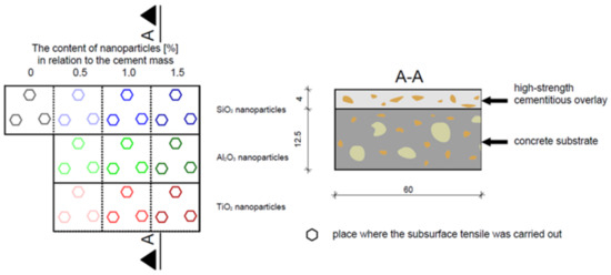 Twenty-eight days after laying the high-strength nano-modified cement mortar overlays on the concrete substrate, the subsurface tensile strength of the overlay was tested following EN 1542 [47]. Figure 5 shows a diagram of a model element designed to test the subsurface tensile strength of a high-strength cement overlay. On the left side of the drawing, a view of the model element is shown, along with the locations of measuring the subsurface tensile strength of the high-strength overlay. In the upper part of the view, the content of the tested nanoparticles (as a percentage of the cement mass) is shown, and on the right side of the view, the type of nanoparticle used. The right side of the drawing shows a cross-section through the model element.
