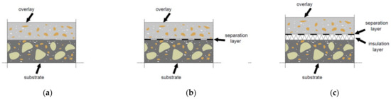 Possible configurations of cement overlays in floors when the overlay is the finish floor: (a) bonded to the substrate, (b) on the separating layer, (c) on the thermal insulation layer.