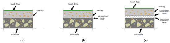Possible configurations of cement overlays in floors when the top layer is the substrate for the finish floor: (a) bound to the substrate, (b) on the separating layer, (c) on the thermal insulation layer.