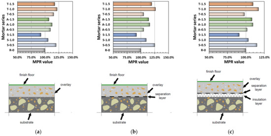 Figure 9 shows graphs of the mechanical performance depending on the adopted variant of the overlay: when the overlay is also a finishing layer: bonded to the substrate (a), placed on the separating layer (b), and placed on the thermal insulation layer (c).