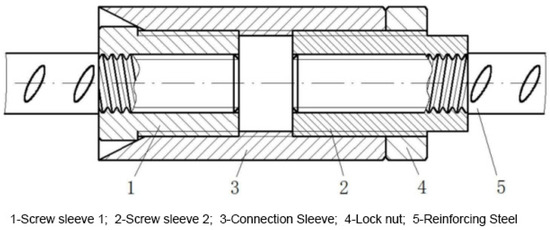 The novel dry sleeve employed in this examination was supplied by Shanghai Hongselect Construction Technology Development Co., Ltd. (Shanghai, China), and the details are illustrated in Figure 1. Compared with the conventional grouting sleeve, the sleeve offers a significant advantage of saving time by eliminating the need for additional support during the construction process. During the construction process, the positioning and connection of the reinforcement at the node are completed by the cooperation of the screw sleeve and the connecting sleeve. Importantly, the vertical alignment of the butt joint is achieved by adjusting the length of the screw sleeve embedded in the connecting sleeve, thus removing the requirement for lateral support and optimizing construction time efficiency. The novel dry sleeve also has three features: (1) Improve construction efficiency: the pitch of all threads of the new type of executive sleeve joint is the same, which can improve the connection speed. (2) High fault tolerance rate: the axial deviation range of the connected steel bar is 0–35 mm; the horizontal deviation range is 0–15 mm. (3) Excellent performance: due to the HRB630 steel bar connection, the sleeve grade can reach 1 level joint performance indicators. The relevant sleeve has been entrusted to Shanghai Jianke Inspection Co., Ltd., and the outcomes of these inspections uniformly meet the requisite standards.