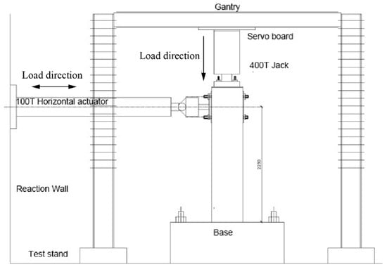Cantilever loading was used in the experimental setup, as shown in Figure 4. The base was securely affixed to the test bench using four screws with a diameter of 75 mm, along with lateral jacks. Horizontal loading was applied by a 100-ton horizontal actuator, while vertical loading was applied to the top of the column using a 400-ton jack featuring with a free-sliding servo plate. The vertical distance from the loading point to the bottom surface of the column measured 2230 mm. The vertical axial load was initially applied to the specimen and maintained at a constant level throughout the test. Subsequently, cyclic horizontal force was applied, initiating with forward loading and followed by tension reverse loading.