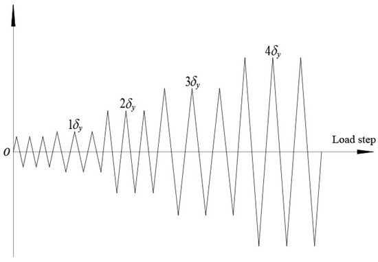 The experimental procedure adopted displacement control loading, with the loading protocol presented in Figure 5. Prior to yielding of the reinforcement bars, the displacement increment was set at 2 mm, and each level of the loading cycle at one time. Post-yielding, the displacement increment was increased to 5 mm, and each level of the loading cycle was repeated three times. The loading was stopped when the specimen bearing capacity dropped to 0.85 Pu, where Pu represents the maximum test value for specimen bearing capacity.
