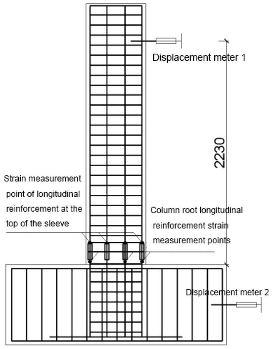 Horizontal displacement was measured using two sets of linear variable displacement transducers (LVDTs). The first set was arranged at the top of the column, precisely at the load position, while the other set was arranged at the mid-height of the base to measure the relative horizontal displacement between the top of the column and the base. The longitudinal strain of the sleeves was measured using 6 mm electrical strain gauges. These strain gauges were positioned at the bottom and top of the sleeve, specifically at 10 mm from the bottom and 10 mm from the top. Figure 6 presents the arrangement of LVDTs and strain gauges.