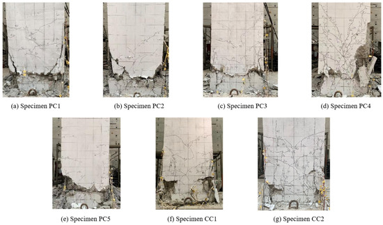When the horizontal displacement reached the range of 10~15 mm, a progressive yielding of the longitudinal reinforcement situated at the bottom of the column occurred, leading to the initiation of horizontal cracks on the tensile surface (east and west) of each specimen. With further increase in displacement, horizontal cracks also appeared on the south and north surfaces of each specimen, and there was a gradual development of horizontal cracks on the east and west surfaces. At 25~30 mm, longitudinal cracks initiated on the east and west corners of each specimen, and oblique cracks began to appear on the south and north surfaces at the same time. At this juncture, the bearing capacity reached its peak. At 35~40 mm, the corner of the column began to be damaged. The oblique cracks on the south and north sides began intersecting, resulting in the generation of longitudinal cracks. Simultaneously, the bearing capacity of each member began to decrease. When the displacement increased to 55~60 mm, the bearing capacity of each member gradually decreased to 85% of the ultimate load, and the concrete within a 300 mm range from the base of the column exhibited ring-shaped spalling, mainly observed on the east and west sides. The corner of the column suffered severe damage, and the cracks on the south and north sides extended to the neutral axis from top to bottom. Ultimately, both specimens experienced failure in a compression–bending mode (Figure 7f,g).