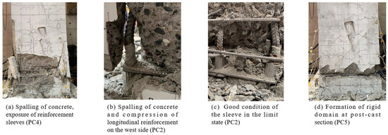 The post-cast region exhibited a rigid behavior due to its higher concrete strength compared with the column body and the presence of numerous sleeves in this region, as depicted in Figure 8d. This contributed to an augmentation in the plastic hinge’s height, surpassing twice the column width. Moreover, inadequate handling during the fabrication process led to the shearing off of a segment of the hoop reinforcement located above the joint surface of the post-cast region. This resulted in inadequate confinement for the core concrete and longitudinal reinforcement in the region. Additionally, the failure occurred due to the complete spalling of the concrete cover in the plastic hinge region, which caused a drastic decrease in the specimen’s cross-sectional area of the specimen and led to a sudden and severe failure.