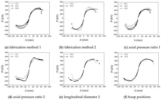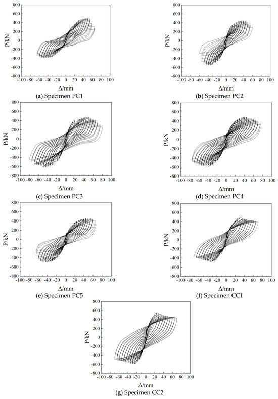 The relationships between the measured actuator force (P) and the measured column top displacement (Δ) for all specimens are illustrated in Figure 9. Prior to the yielding of the steel, the P-Δ hysteresis curve exhibited a narrow profile, accompanied by small residual strain and low energy dissipation capacity. However, once yielding occurred, the P-Δ curve began to shift towards the displacement axis, resulting in a gradual expansion of the hysteresis loop area, thereby indicating an increased energy dissipation capacity. Furthermore, during each subsequent cycle at the same loading level, the area enclosed by the P-Δ curve experienced a slight reduction as the number of cycles increased. The hysteresis curves of the conventional cast-in-place specimens, CC1 and CC2, exhibited a distinct shuttle-shaped pattern, with CC1 demonstrating a slight pinching effect. Notably, the pinching effects were more pronounced in specimens PC1 and PC5, characterized by lower axial compression ratios compared with PC2, PC3, and PC4, which had higher ratios. These contrasting results can be attributed to the occurrence of cracks and shear slippage, specifically at the upper bond surface of the post-cast region, during testing. The results obtained from PC2 and PC3 indicate that the diameter of the longitudinal reinforcement had no influence on the shape of the hysteresis curves. Similarly, the hysteresis curves of PC3 and PC4 indicate that the stirrup spacing had no impact on their characteristics. Interestingly, there was no significant disparity was observed between the hysteresis curves of PC1 and PC5. This can be attributed to the absence of shear slippage at the lower bond surface of the post-cast section, as well as the absence of dowel action in these specimens.