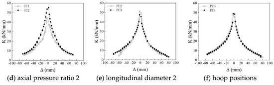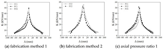 The stiffness degradation curves of all specimens are illustrated in Figure 11, where the secant stiffness K is employed to characterize the stiffness degradation. The peak load and the corresponding displacement during the cyclic loading phase are denoted as and , respectively, with calculated as the ratio . A comparison between the results of PC2 and CC2 reveal that the precast column exhibits a lower stiffness compared with the CIP column. However, the findings from PC1 and CC1, as well as PC5 and CC1, indicate that the stiffness of the precast columns closely approximates that of the CIP columns. Consequently, further research is warranted to delve deeper into this matter. Contrastingly, comparisons involving CC1 and CC2, as well as PC1, PC2, and PC5, reveal that specimens with higher axial compression ratios exhibit higher initial stiffness yet endure a more pronounced rate of stiffness degradation. The outcomes of PC2 and PC3 suggest that specimens with larger longitudinal reinforcement diameters experience a slightly slower rate of stiffness degradation than those with smaller longitudinal reinforcement. Furthermore, the results of PC3 and PC4 indicate minimal disparities in the stiffness degradation curves concerning varying stirrup spacing. The absence of cracks and shear slippage at the lower interface of the post-cast section region in PC5 results in design parameters that closely resemble those of PC1. Consequently, the stiffness degradation curves in the reverse loading direction for PC1 and PC5 are nearly indistinguishable. However, an anomalous behavior is observed when PC1 is subjected to loading in the forward direction.