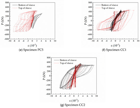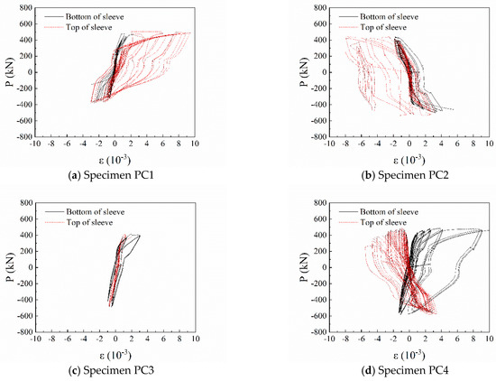 The hysteresis curves of longitudinal reinforcement strain for each specimen are shown in Figure 12. The longitudinal steel strain, denoted as , was obtained from strain measurement points located at both above and below the sleeves. In the initial loading phase, the hysteresis curves of steel strain exhibited a narrow and slender profiles. The residual strains remained minimal, and the curves exhibited a gradual change in the slope. As loading displacement increased and steel yielded, the slope of the curves progressively decreased, accompanied by an increase in residual strains. At the onset of loading, the strain curve above the sleeves closely resembled the corresponding curve below the sleeves. However, post-yielding, a noticeable divergence between these two curves emerged, with the gap progressively widening. Except for PC3, all specimens reached a state of yielding in the longitudinal steel strains measured above the sleeves upon reaching the peak load, indicative of a plastic hinge region development above the sleeves. In the ultimate state, both longitudinal steel strains above and below the sleeves exhibited yielding behavior.