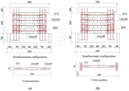 As shown in Figure 3, the overall height of the specimen was 2700 mm, while a top beam with a height of 400 mm and a bottom beam with a height of 700 mm were poured with the wall to provide end constraints. Two wall section types were constructed to investigate the influence of flanges on the seismic performance of the specimen. The specimens were divided into three functional zones, namely a load-bearing component composed of fully grouted CMWs, an in-fill component composed of ungrouted CMWs, and a weak plane composed of AAC blocks. To enhance the interaction between the load-bearing component and in-fill component, AAC blocks were placed in the shape of teeth; meanwhile, two plain bars were placed at the mortar layer of the ungrouted CMW and anchored in the fully grouted CMWs. To make comparisons with previous research, these specimens adopted a similar naming principal in Chi et al.’s study [18], where the symbol P was introduced to represent prestressing technology. Therefore, the specimen with a rectangular section was named IMFP, while that with a T-shaped section was named IMFTP. Detailed configuration information of the two specimens can be found in Figure 3 and Table 1.