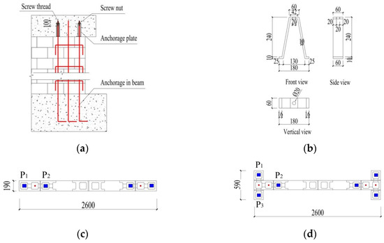 Details of prestressing technology: (a) schematic of prestressing technology, (b) anchorage plate (dimensions in mm), (c) prestressing zone in IMFP, and (d) prestressing zone in IMFTP.