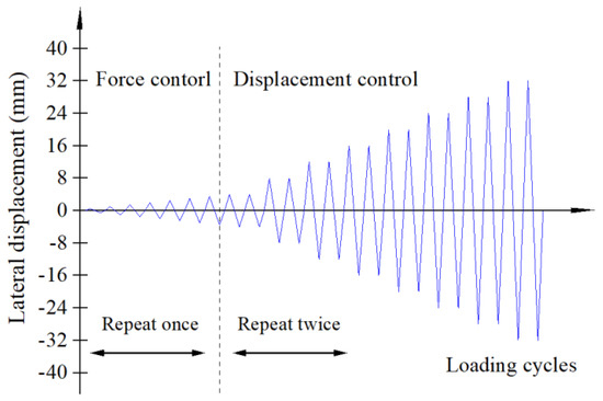 A force displacement loading mode was adopted in this experiment, and the loading protocol is plotted in Figure 7. A positive loading direction was defined as the direction when the lateral actuator applied thrust force on the specimen; accordingly, a negative positive loading direction was defined as the opposite direction, as shown in Figure 6. A force control loading protocol was adopted in the early loading stage to obtain information on the specimen in the elastic stage. Each load stage was repeated once, and the loading rates were 10 kN/min, indicating a quasi-static loading mode. When the inflection point occurred at the hysteretic curve, the force control loading protocol was replaced by the displacement control loading protocol, while the displacement cycle was repeated twice at each control displacement. In order to conduct a comparative discussion with previous research, the displacement control loading protocol used in this experiment was consistent with that used in Chi et al.’s study [18]. The damage propagation and deformation of the specimen were recorded in a timely manner during the experiment. Finally, the experiment was terminated when the lateral resistance of the specimen decreased to 60% of the maximum lateral resistance of the specimen measured in the test.