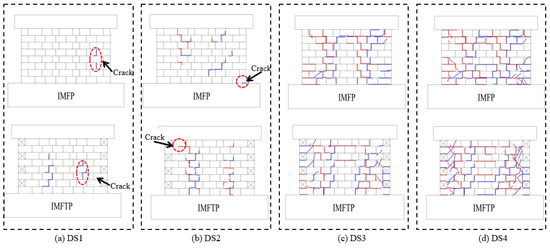 Figure 8 clearly indicates that stepped cracks first occurred in the mortar layers around the weak planes of the specimen. This phenomenon was consistent with the previous assumptions made about the functional zone of the specimen. As there was an increase in the loading force, cracks around the weak plane developed fully and occurred at the load-bearing component of the specimen, indicating that the specimen reached DS2. After that, with an increase in the loading displacement, weak planes were squeezed by functional components on both sides; hence, the mortar layers around the weak planes were split, and gaps appeared between the load-bearing component and in-fill component. Cracks were gradually observed at the top or bottom zone of the load-bearing component and in-fill component during the process of the specimen from DS2 to DS3, as shown in Figure 9. However, owing to the increase in the gaps, the cracks in the in-fill component were observed to no longer increase with the increase in the displacement, which demonstrated that the in-fill component did not participate in the later loading process of the whole specimen. Finally, damage to the load-bearing component gradually accumulated, and the in-fill component gradually withdrew from the specimen, leading to a decrease in the load-bearing capacity of the specimen.