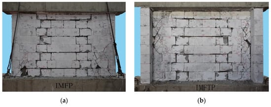 The final failure patterns of the specimens are shown in Figure 10. The similarity of the failure patterns of the two specimens was that the weak planes were seriously damaged, while the in-fill component still maintained in-plane integrity with few cracks. The load-bearing components were also seriously damaged; however, the failure pattern of each specimen was different according to the section type. For specimen IMFP with a rectangular section, the cracks were concentrated at the top and bottom zones, and bottom masonry face spalling occurred. However, for specimen IMFTP with a T-shaped section, the cracks were distributed uniformly, and cross-cracks occurred at the middle of the web plane of the load-bearing component, while only horizontal cracks were observed at the flange plane. Based on the typical failure characteristics of masonry walls in previously conducted studies in the literature [13,14,15], it could be concluded that bending failure and shear failure occurred in specimens IMFP and IMFTP, respectively.