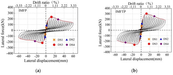 Based on the cyclic test results, the load–displacement hysteretic curves of the two specimens were plotted, as shown in Figure 11. The envelop curves and four damage state characteristic points are also depicted in Figure 11. The drift ratio (DR) was defined as the ratio of the top displacement and loading height of the specimen for subsequent analysis, while the loading height was calculated as 1800 mm, as shown in Figure 6. Therefore, a significant and nearly symmetrical pinching effect was observed in the load–displacement curves of the two specimens. The appearance of the overall load–displacement curves was S-shaped, and an obvious slip phenomenon was observed in the unloading stage of each loading loop. The lateral resistance of the specimen increased rapidly at the prepeak stage of the load–displacement curves and decreased gradually at the postpeak stage. Moreover, the characteristic point information corresponding to different damage states is listed in Table 4 and marked in Figure 11. The existence of flanges increased the maximum lateral resistance of specimen IMFP by 32% compared to specimen IMFP, and the positive lateral resistance of the two specimens was higher than the negative lateral resistance owing to damage accumulation. Therefore, a detailed discussion of the seismic performance of the two specimens is carried out in the next section, and the relevant data of the comparison of specimens IMF and IMFT introduced by Chi et al. [18] were also adopted to assess the influence of the prestressing technology on the specimen.