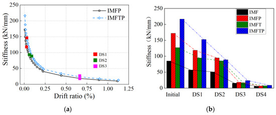 Stiffness is an important index of the seismic performance of specimens that can be used to restore the model and nonlinear analysis of the specimens. In this study, the secant stiffness was calculated from the slope of the line that joins the positive and negative peaks in each loading cycle [43,44], and the initial stiffness was determined as of the first loading cycle. Table 6 presents the values of that which responded to each damage state of the specimen, and at each damage state was also calculated and recorded for the normalization analysis. To clearly compare the stiffness degradation of the specimens, the stiffness of the specimens before they reached DS3 was analyzed, and the value of of the specimens with respect to DR is plotted in Figure 14a, while the stiffness of the specimens at a different DSs is plotted in Figure 14b. Moreover, to analyze the influence of the prestressing technology, the data of specimens IMF and IMFT related to different damage states were also adopted and are listed in Table 6.