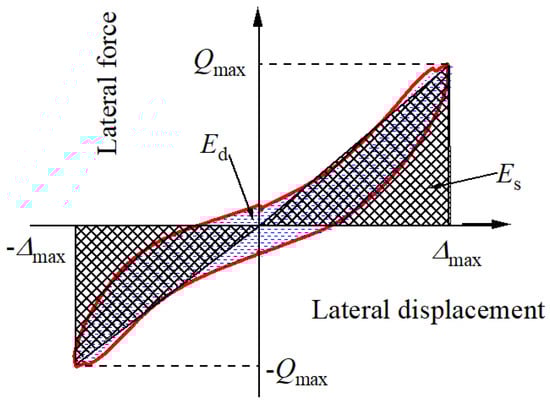 The displacement ductility can be used to evaluate the deformation capacity of specimens subjected to seismic load, thus avoiding brittle failure. In this study, the displacement ductility was defined as the ratio of the ultimate displacement () to the yield displacement (). The ultimate displacement was chosen as the corresponding displacement of DS4, and the yield displacement was calculated using the energy equivalence method [45,46], as shown in Figure 16. Considering the influence of damage accumulation caused by the cyclic loading protocol, the analysis of the displacement ductility was calculated using data only from the positive direction. Hence, the calculation results of the two specimens used in this study and the comparison specimens in Chi et al.’s study [18] are listed in Table 7.