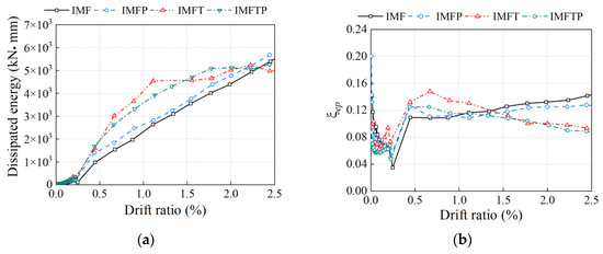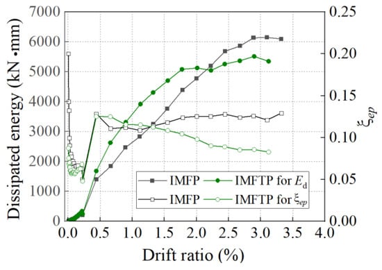 In general, the energy dissipation was calculated by the area enclosed by a single cycle of the load–displacement curve, as depicted by blue dashed lines in Figure 17, and the equivalent viscous damping can be calculated using formula , where Es is the strain energy at the maximum lateral force of the same cycle, which is depicted by black lines in Figure 17 [47]. Therefore, the energy dissipation and equivalent viscous damping of two specimens were plotted, as shown in Figure 18. Figure 18 clearly indicates that the energy dissipation of the two specimens increased rapidly after a DR of 2.0%, while that of specimen IMFTP tended to remain constant after a DR of 2.0%. Additionally, the equivalent viscous damping initially decreased, followed by a slight increase, and then a constant value was reached after a DR of 1.5% was achieved. Specimen IMFP finally converged at 8%, while specimen IMFTP finally converged at 14%, respectively.