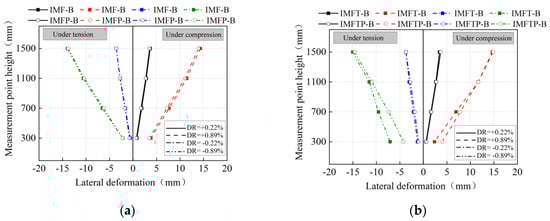 The crack propagation and deformation of specimens IMFP and IMFTP and the comparison specimens IMF and IMFT at the same DR are shown in Figure 20 and Figure 21, respectively. As mentioned before, flexural failure was observed at the load-bearing component of IMFP, while shear failure was observed at the load-bearing component of IMFTP. Therefore, a similar failure pattern was observed in the specimens with a similar configuration of the load-bearing component, indicating that the prestressing technology did not change the failure pattern of the specimens. However, fewer and finer cracks were observed in the specimen with the prestressing technology, which showed that the prestressing technology improved the damage propagation of the specimen. With regard to the deformation of the specimens, IMFP-B represented that the load-bearing component of IMFP was away from the loading lateral actuator. The deformation of the specimens at different DRs was chosen corresponding to the specimens in different damage states. It could be observed that the deformation of the specimens could basically remain straight at a DR of 0.22%, while an inflection point occurred at a height of 1100 mm in specimens IMFP and IMFTP at a DR of 0.89%. As shown in Figure 21a,b, the deformation of specimen IMFP-B was slightly lower than that of the comparison specimen, while the deformation of specimen IMFTP-B was larger than that of specimen IMFT-B at a DR of +0.89%. This reflected a higher compressive stress and deformation in the bottom zone of IMFTP-B than in that of specimen IMFT. This phenomenon was related to the prestressing technology and failure pattern of the specimen. The prestressing technology could improve the specimen cracking situation caused by insufficient tensile strength; however, it could have had an impact on the compressive failure of the specimens due to having a smaller margin to develop new compressive strains. With regard to specimen IMFTP, the zone of the specimen at a height between 300 mm and 1100 mm was in the shear-compression zone, which may have resulted in larger deformation due to damage propagation. Therefore, it could be concluded that the prestressing technology had a positive influence on the damage propagation and deformation of the specimen before DS3; however, additional research on the deformation of the compression zone of specimens caused by a high compressive stress is essential, which will hopefully provide a reference for the value of prestressing in future structural design.