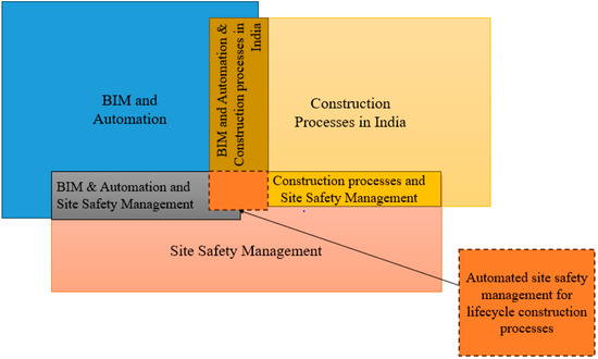 To identify opportunities for automated BIM-based site safety management, it is important to study and understand the existing site safety management processes. This research, although focused on site safety management practices in India, examines research from outside India. This helps us to understand advancements in site safety management practices globally and, as appropriate, apply lessons locally, i.e., within the Indian site safety management context. To understand the current processes, this research examined the current literature (topics covered in Figure 1) and includes findings from discussions with site safety experts. The key topics examined in this research are illustrated in the Venn diagram (Figure 1).
