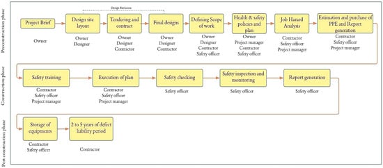 It is also important to understand the flow of these safety-related processes, the stage at which they are conducted, and the people who are involved in this process during the lifecycle of the construction project. On a typical construction project, the execution of work is mainly carried out in three different stages consisting of preconstruction, construction, and post-construction [21]. The preconstruction stage mainly includes the project brief, defining the client/user’s requirements and objectives in sufficient detail to enable the proposed facility to be designed and specified [22]. Designing is the most important step in any construction project. Based on designs, the contracts and tendering are invited for procurement. Various contractors submit their tenders. Considering the safety procurement, for large-scale projects following good safety measures, a separate safety department is appointed, but in the case for small-scale projects, safety is taken up by local contractors [23]. At the design stage, the factor of safety is considered by the designers. The factor of safety is the load-carrying capacity of a structural system beyond what it supports. Thus, the safety consideration in conventional design pertains to structural safety, as opposed to the practice of site safety management. Designers are not asked to consider worker safety [23], and, in the current safety practice, designers are held responsible for the safety of end-users while construction worker safety is the contractors’ responsibility [24]. After the finalization of the project by contractors, the planning department, along with the safety officer/inspector, defines the scope of work and finalizes the activities and their estimated times. The individual plan for each construction activity, i.e., excavation, slab-laying, etc., is designed as per the scope. Further, as per the scope, a health and safety plan is designed, which involves a Job Hazard Analysis (JHA) as a key tool to identify how to perform a step-by-step appraisal of the “job tasks and early identification of any hazards associated with the task, so controls to mitigate the hazards can be introduced”. This critical step, with its emphasis on job task analysis, ensures the early identification of hazards before they result in injury. Hazards are difficult to predict because even though the activities performed are similar or even the same, every construction project has its unique location, time schedule, and work conditions [25]. Moreover, construction sites are dynamic, and even if the hazards were accurately predicted for such precisely defined conditions, there is a large probability that the conditions could change by the time the construction activity is scheduled to be performed. The next step after identifying hazards and before deciding on mitigation strategies is determining the risk levels of the hazards. The risk level is most often determined by multiplying probability and severity scores. Quantifying severity, on the other hand, is much more abstract and is dependent on the safety expert’s judgment [25]. Further, as per the requirements made in the JHA plan, the safety equipment is estimated and purchased for execution.