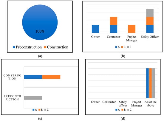 Analysis of quantitative questions from semi-structured interviews: (a) stage of a construction project at which safety-related processes initiate, (b) responsible stakeholder for the execution of the safety plan at the construction stage, (c) stage at which safety officers get involved in the construction project, (d) stakeholders involved in the safety management process.