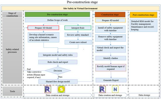 At the end, in the post-construction stage, the data which are created throughout the process are stored and used for facility management purposes. These data can be used for future projects/renovation of the building, and maintenance purposes [67]. The data generated through the safety checking process can be used for similar kinds of projects to locate hazard cases, their mitigation, and equipment information, eliminating the repetition of all the safety checking steps.