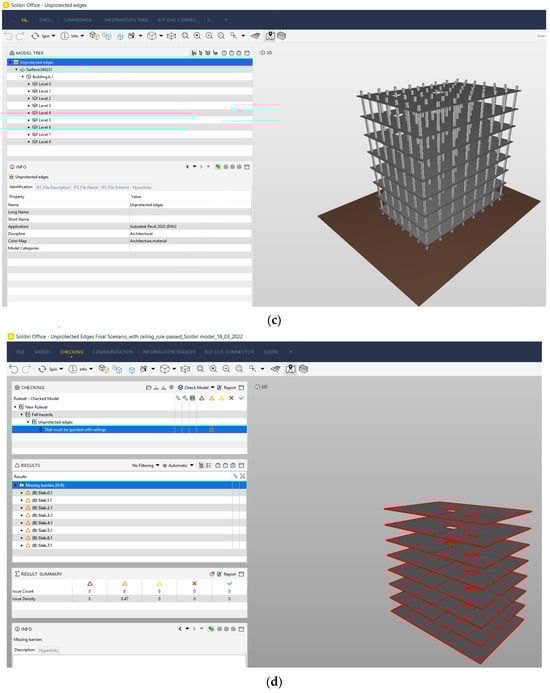 The safety rule for the case of an unprotected edge of a slab is identified from OSHA. In Solibri Office, using the ruleset manager, the rule is created as “Slab must be protected with guardrails” and all the required dimensions of the guardrails are converted into a parametric table. Further, for the purpose of integration, the 3D model is converted to IFC and transferred to Solibri Office (Figure 5c). Furthermore, the rule checking is performed in Solibri, and it runs successfully. The hazards are identified and represented by missing barriers along the edge of the slab, highlighted with a red-colored line (Figure 5d).