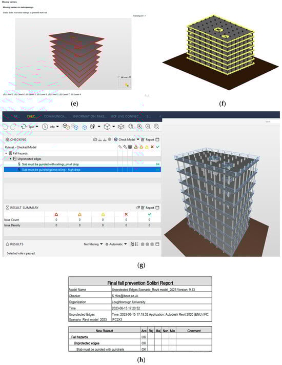 Validation of the framework for a sample model: (a) 3D model prepared in Revit, (b) safety rule interpretation in Solibri, (c) integration of model, (d) rule checking and hazard identification, (e) generated hazard report, (f) corrective actions taken in 3D model, (g) rechecking after corrective actions, (h) generated safety report.
