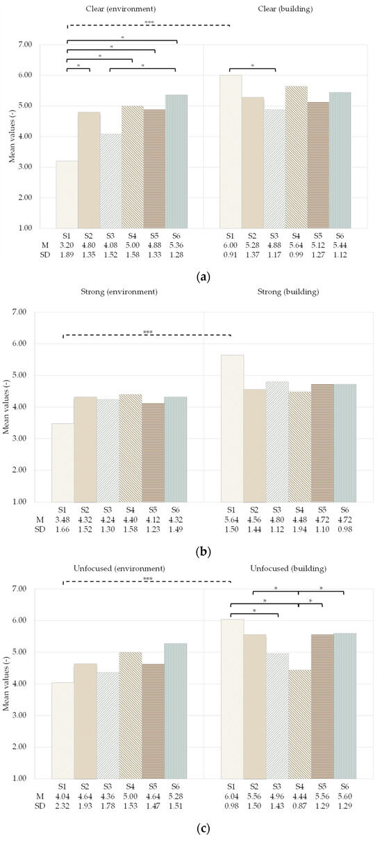 Strong (see Figure 11b): The between-subject analysis results highlight no significant effects of light scenario on the item strong, neither related to the entire virtual environment (F(5,144) = 1.333, p = 0.254) nor when participants were asked to focus on the building façade (F(5,144) = 2.283, p = 0.049). The results of the within-subject analysis point out the significant effects of task assignment on the item (F(1,144) = 30.05, p < 0.001). The post hoc test reveals a significant increase in the mean value from the not-assigned to the assigned task for S1 p < 0.001.