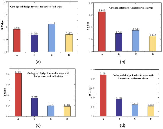 Using the orthogonal design method described above, an energy consumption analysis was performed for four of the five major climate zones in China, excluding the temperate zone. The primary and secondary relationships between the effects of solar reflectance (A), long-wave radiation rate (B), heat transfer capacity (C), and heat storage capacity (D) on building energy consumption are displayed in
