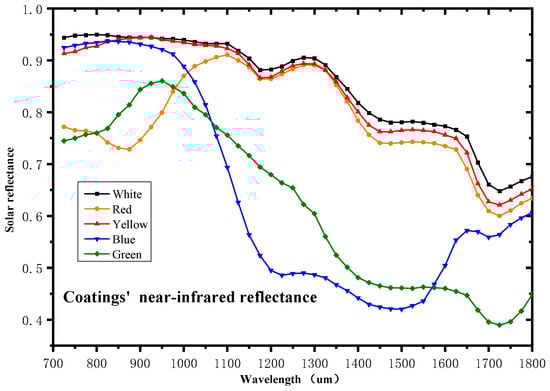 For pure white pigment, i.e., 100% titanium dioxide + 5 μm hollow SiO2 glass beads + water-based epoxy resin coating, the calculated reflectance is 0.85. For yellow pigment, i.e., 50% titanium dioxide + 50% Nickel Titanium Yellow + 5 μm hollow SiO2 glass beads + water-based epoxy resin coating, the calculated reflectance is 0.75. For red pigment, i.e., 50% titanium dioxide + 50% Silicon Iron Red + 5 μm hollow SiO2 glass beads + water-based epoxy resin coating, the calculated reflectance is 0.68. For blue pigment, i.e., 50% titanium dioxide + 50% Cobalt Blue + 5 μm hollow SiO2 glass beads + water-based epoxy resin coating, the calculated reflectance is 0.62. For green pigment, i.e., 50% titanium dioxide + 50% Cobalt Green + 5 μm hollow SiO2 glass beads + water-based epoxy resin coating, the calculated reflectance is 0.56.