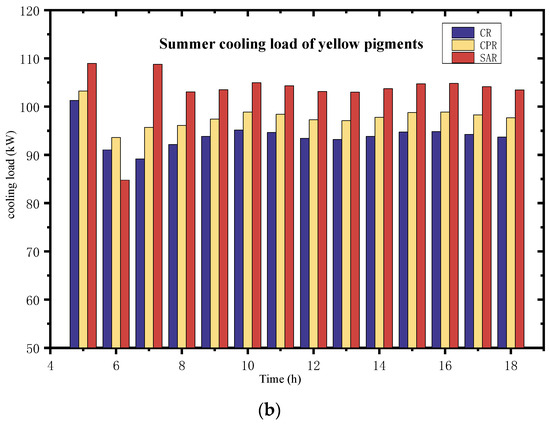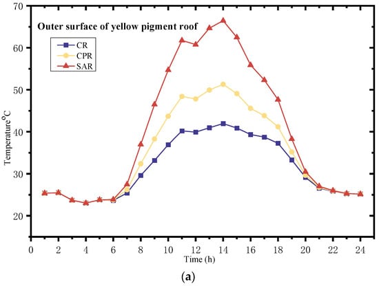 Figure 7 displays the external surface temperatures and hourly heat loads for the yellow-pigmented roofs during the summer. From the graph, it is evident that, compared to conventional yellow pigments, the titanium nickel yellow cool material exhibits an increase of 0.24 in reflectance. Consequently, the maximum external roof surface temperature during the summer decreases by 9.4 °C, resulting in a maximum instantaneous energy savings of 4.1%. Compared to a black roof, this translates to energy savings of 9.5%.