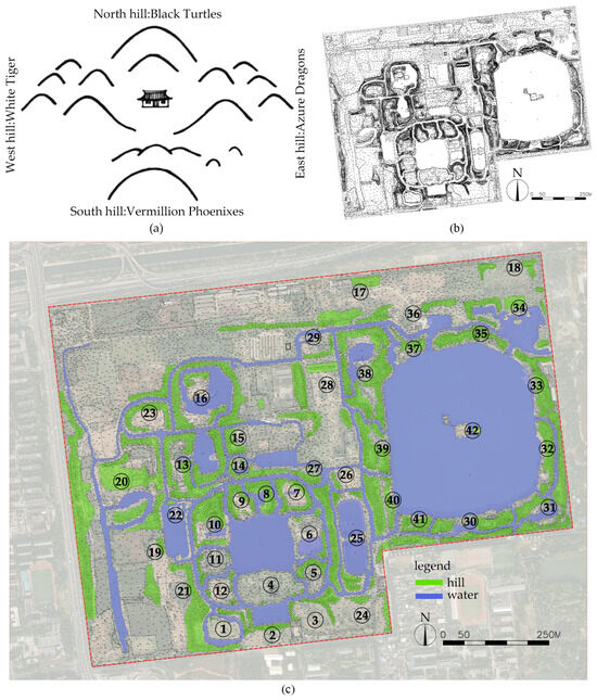 (a) Enclosure layout mode of earthen hill space. (b) Measured topographic map of Old Summer Palace Ruins Park in 2016. (c) Spatial distribution map of 42 earthen hills in the Old Summer Palace Ruins Park.