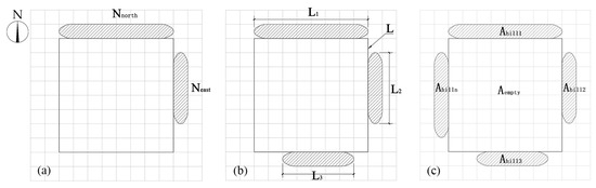 (a) Schematic diagram of direction index for the enclosure layout in an earthen hill space. (b) Schematic diagram of density index for the enclosure layout in an earthen hill space. (c) Schematic diagram of area index for the enclosure layout in an earthen hill space.