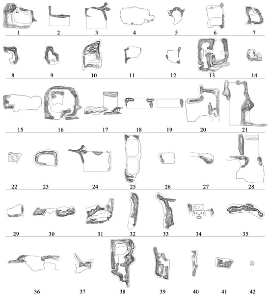 Utilizing AutoCAD v.2010 software, 42 earthen hill spaces in the Old Summer Palace Ruins Park were separately extracted (Figure 3). Subsequently, the direction, spatial perimeter, total length of the surrounding earthen hill, spatial area of the earthen hill, and area of the surrounding earthen hill were statistically analyzed for each earthen hill space. The direction, density, and area index equations were then utilized to obtain the numerical statistical table for the enclosure layout direction, density, and area in the 42 earthen hill spaces of the Old Summer Palace Ruins Park (Table 1).