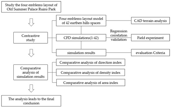 We examined the influence of various enclosure layout indices on the outdoor wind environment by analyzing three indices, i.e., direction, density, and area, of 42 earthen hill spaces in the Old Summer Palace Ruins Park. To ascertain the accuracy of the CFD simulation, a single earthen hill space from the 42 earthen hill spaces in the Old Summer Palace Ruins Park was chosen to compare the measured wind speed values with the CFD simulation wind speed. Autocad v.2010 software was employed to draw topographic maps of the 42 earthen hill spaces in the Old Summer Palace Ruins Park and the direction, density, and area indices of these spaces was calculated. Subsequently, CFD simulations were performed on all 42 earthen hill spaces using PHOENICS v.2016 software in order to compare and analyze the influence of direction, density, and area indices on the outdoor wind environment and to draw research conclusions. The research framework is illustrated in Figure 4.