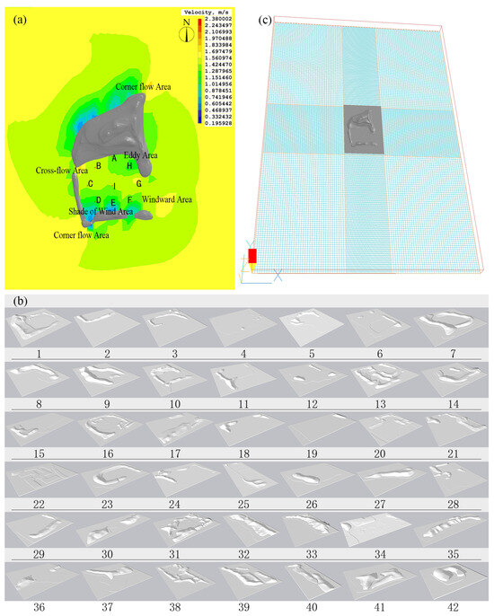 (a) Distribution map of wind speed measurement points. (b) PHOENICS mesh settings. (c) Spatial model of 42 earthen hills in the Old Summer Palace Ruins Park.